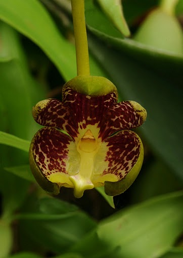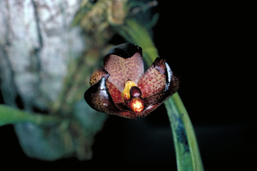 Found in Papua New Guinea in rainforests as an epiphyte at elevations of 150 to 500 meters as a small to just medium sized, hot growing epiphyte with a long, thick, creeping rhizome covered in brown bristles giving rise to large, erect, ovoid to oblong, green, smooth in youth and rugose with age pseuodbulbs that are enveloped basally by a ring of brown bristles and having 2 to 6" between each pseudobulb carrying a single, apical, oblong to elliptic, obtuse to retuse, petiolate, stiff, thick and leathery leaf that blooms in the spring, summer and fall a single flowered, basal, 4" [10 cm] long inflorescence with 5 papery brown sheathing bracts giving rise to a waxy, not opening well, upward facing, slightly scented flower that has a goblet appearance with the column in the middle.