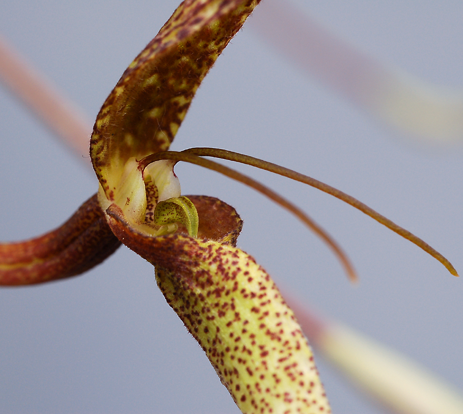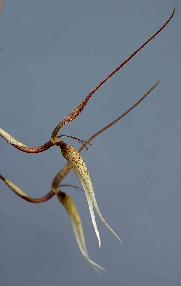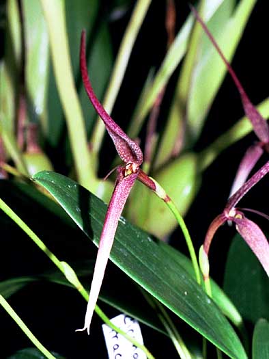 Found in Papua New Guinea, Solomon Islands, Fiji and Samoa as a small sized, cool to cold growing epiphyte on moss covered branches of large forest trees that occurs at elevations of 2300 to 3000 meters with tan to red close set pseudobulbs carrying a single, apical, yellow basally , green elliptic blade, petiolate leaf that blooms in the winter on a basal, slender, 7.2" [18 cm] long, single flowered inflorescence with minutely lanceolate, acute, keeled, much shorter than the curved ovary floral bracts that is held above the leaves.