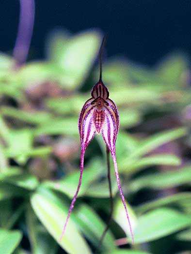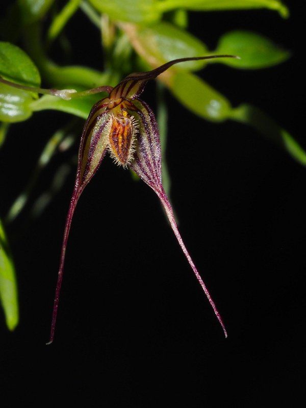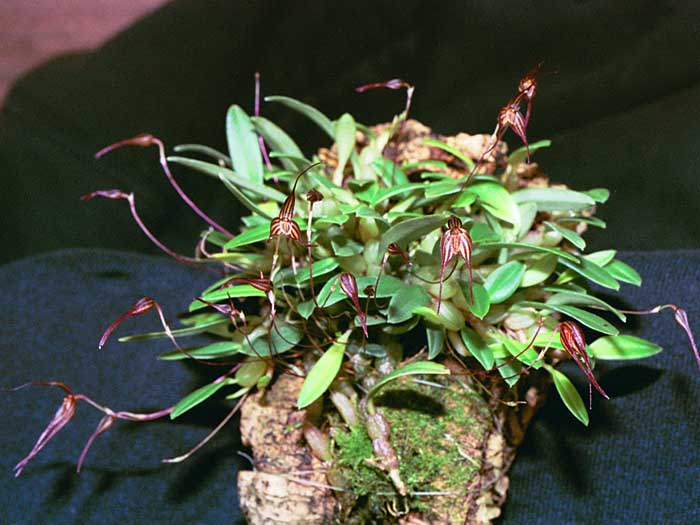 Found in Papua New Guinea in rainforests at elevations of 1000 to 3300 meters as a mini-miniature sized, warm to cold growing epiphyte with a creeping, frequently branching rhizome giving rise to close set, ovoid to oblong, shallowly ribbed pseudobulbs carrying a single, apical, erect to suberect, coriaceous, elliptic to obovate, acute, gradually narrowing below into the petiolate base leaf that blooms in the spring and fall on a basal, erect, filiform, 1.6 to 3.4" [4.5 to 8 cm] long, single flowered inflorescence with tubular, acute to acuminate, shorter than the ovary floral bracts.