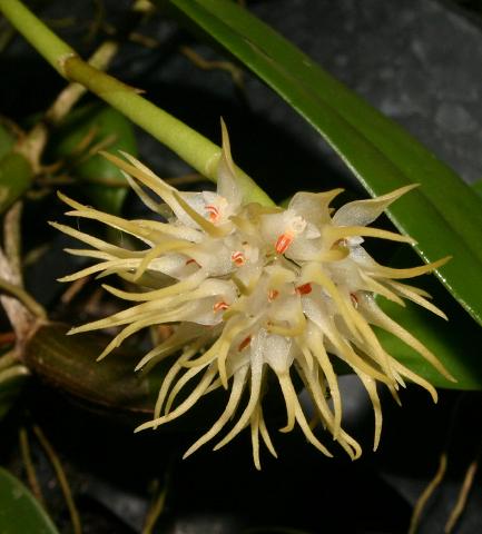 Found from eastern Himalayas, Assam, Thailand, China at altitudes around 800 to 1800 meters as a miniature sized, warm growing epiphyte with tubular shaped, rugose psuedobulbs carrying a single apical, broadly linear, petiolate leaf that blooms in the spring in the a slender, basal, 1 5/8" [4 cm] long inflorescence with 3 solitary acuminate bracts and carrying a cluster of several to many apical flowers. This species is similar to B. odoratissimum.