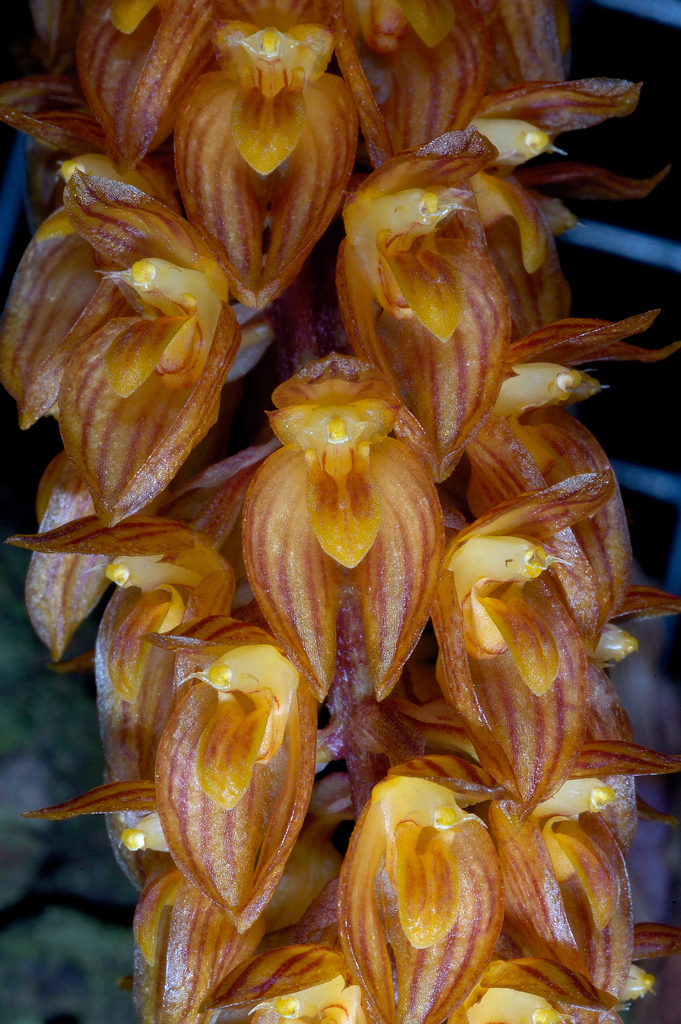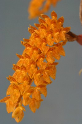 Endemic to Thailand and occurs around 1200 to 1290 meters in elevation as a miniature sized, cool growing epiphytic species with .8 to 1.6" [2 to 4 cm] between each conical pseudobulb arising on a woody rhizome and carrying a single, apical, light green above, dark green beneath, petiolate leaf with a median vein that flowers in the winter on a pendant, 3 1/5" to 3 3/4" [8 to 9 cm] long, densely many flowered inflorescence with 3 bracts.