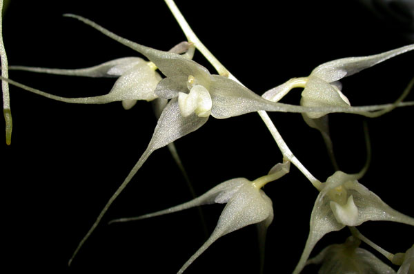 Found in the Moluccas and New Guinea in primary forests at elevations of 300 to 2400 meters as a scrambling, mini-miniature to small sized, hot to cool, patent to pendulous growing epiphyte with ovoid pseudobulbs carrying a single, apical, erect, ovate to elliptic, flat to semi-terete in cross-section, acute to acuminate, narrowing below into the petiolate base leaf that blooms in the later spring through fall on a basal, generally pendulous, .2 to 6" [.5 to 15 cm] long, 1 to 18 flowered inflorescence with ovate to triangular floral bracts.