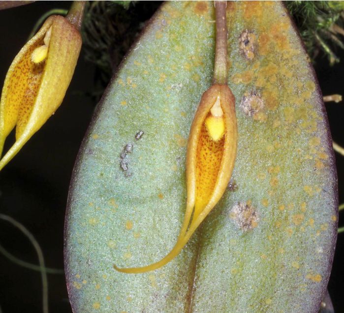 Found in western New Guinea in lowland forest at elevations around 60 meters as a mini-miniature sized, hot growing epiphyte with a creeping rhizome with .16 to .36" [.4 to .9 cm] between each making an acute angle with the rhizome, obliquely ovoid, when dried quadrangular pseudobulbs carrying a single, apical, obovate to oblong-obovate, margins revolute, sometime violet beneath, midrib above grooved, below prominent, apex frequently somewhat contracted, obtuse or broadly obtuse, sometimes minutely apiculate, cuneate-narrowed and conduplicate below into the base leaf that blooms in the fall and winter on a terete peduncle, part present in sample .22" [.55 cm] long, single flowered inflorescence with a obliquely funnel-shaped, triangular-acuminate, acute, keeled, shorter than the ovary floral bract and carrying orange flowers with red or red-brown markings.