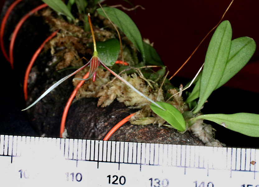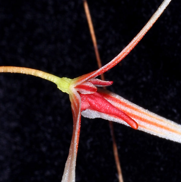 Found in Thailand, penninsular Malaysia and Borneo at elevations around 800 meters as a mini-miniature sized, warm growing epiphyte with small, globose-ovoid, apically offset so as the leaf arises at an angle to the apex and carrying a sinle, elliptic to elliptic-oblong, rounded, basally twisted, petiolate base leaf that blooms in the fall on an erect, from the rhizome, with a inflated, bract below the middle, 6" [15 cm] long, single flowered inflorescence with a tubular, acute floral bract.