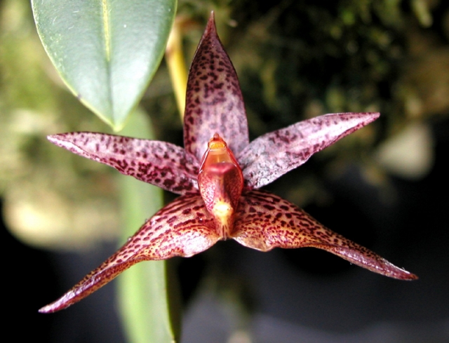 Found in New Guinea on thick tree trunks in forests at elevations around 1000 meters as a small sized, warm growing epiphyte with 6 to 6.8" [16 to 17 cm] between each cylindrical, glabrous pseudobulb carrying a single, apical, erect, lorate, obtuse, attenuate below into the subpetiolate base leaf that blooms in the summer on a short, .8" [2 cm] long, single flowered inflorescence with cucculate bracts.