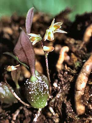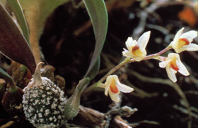 Found in the north island of New Zealand in lowland native conifer canopy always with a blue-grey lichen as a mini-miniature sized, cool growing epiphyte with clustered, pear to ovate shaped, smooth becoming wrinkled with age pseudobulbs with white, wax-like extrusions if in flower and carrying an erect, tawny, pale green to purple beneath leaf that blooms in the fall on an erect, basal, 2 to 3 flowered inflorescence