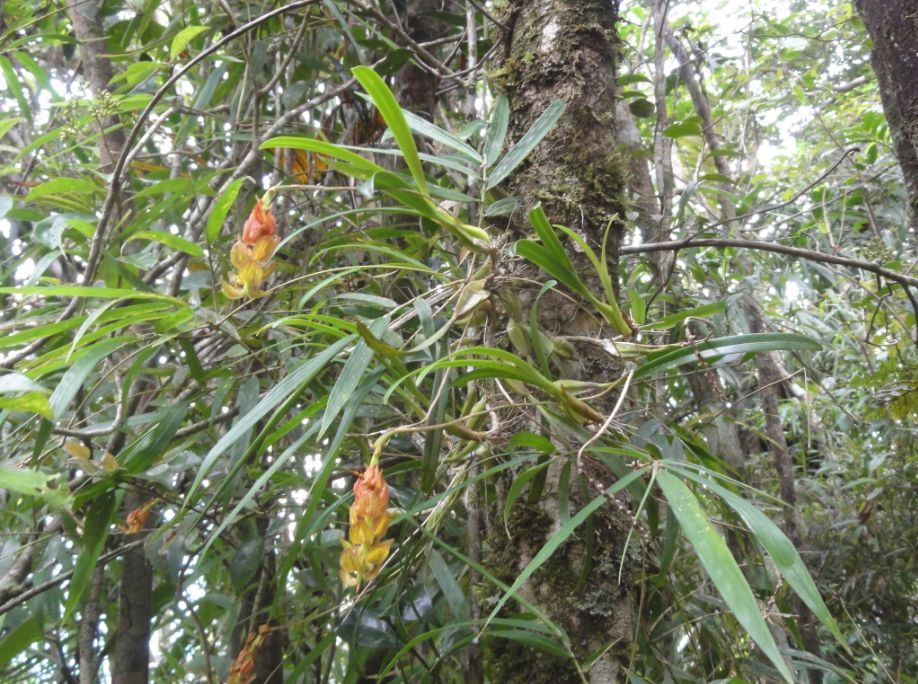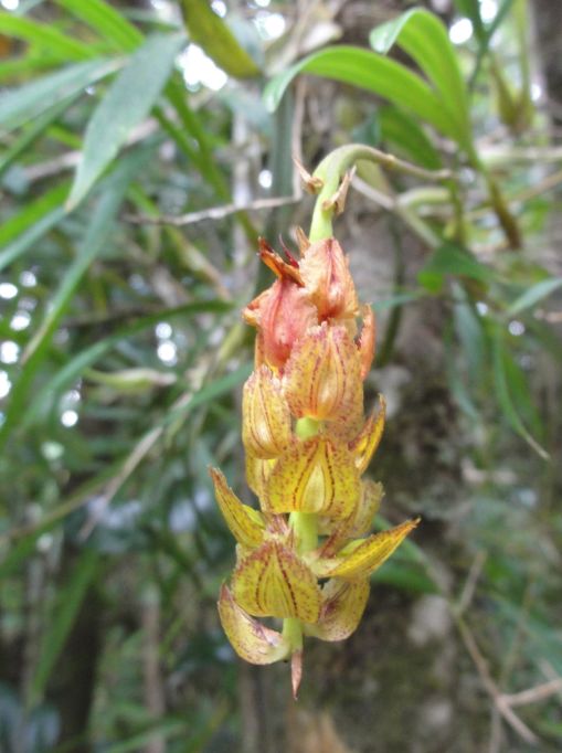Found in southcentral Madagascar in moist montane forests at elevations around 950 to 1150 meters as a mini-miniature sized, warm to cool growing epiphyte with clustered, ovoid, 4 to5 angled pseudobulbs carrying 2, apical, loriform leaves that blooms in the late summer and early fall on an erect, rachis at an obtuse angle to the peduncle 6.8 to 8.8" [17 to 22 cm] long, densely many flowered inflorescence with elliptic, longer than the flower, refelexed floral bractts and reflexed flowers.