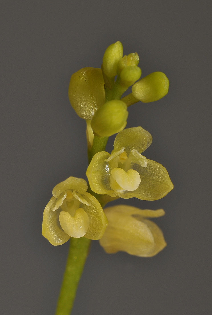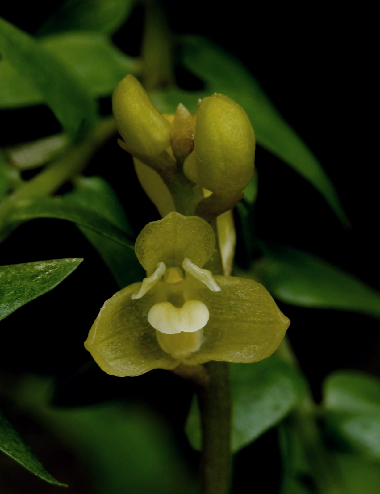 Found in Sumatra, Java, Borneo and Sulawesi in lower montane forests at elevations around 900 to 2500 meters as as small sized, hot to warm growing epiphyte with a short, branched rhizome with small disc-shaped, green pseudobulbs carrying a single apical, erect, linear-lanceolate, gradually narrowing below into the petiolate base leaf that blooms in the early summer on 1 to 2, basal, to 6.4" [to 16 cm] long, laxly 20 to 30 flowered inflorescence arising on a newly matured pseudobulb carrying well spaced flowers