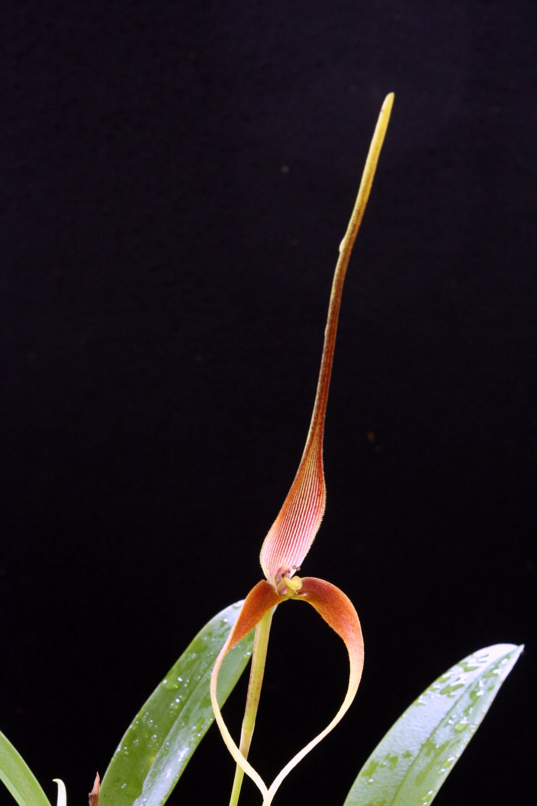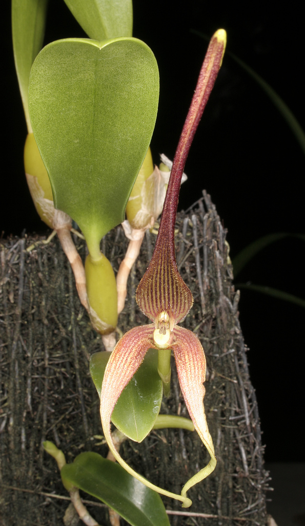 Found in Indonesia, Papua New Guinea, and Borneo as an epiphyte at elevations of 160 to 500 meters on the lower trunks of large trees in rainforest margins and semideciduous forests as a miniature sized, hot growing epiphyte with 1 to 2" between each, cylindrical, straight then curved, elongate pseudobulbs carrying a single apical, oblong, petiolate and channeled below leaf that blooms in the spring and fall on a basal, lateral, slender, 5 1/2" [14 cm] long, single flowered inflorescence that holds the wide open flowers above the leaves.
