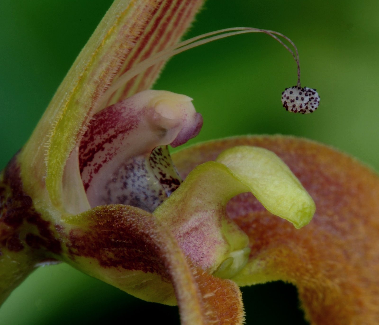 This orchid and B kermesianum are quite close at a casual glance but a more detailed examination of the lip and column reveals that this species has very globular shaped terminations to the petals and B unitubum has tear drop shaped terminations to its petals.