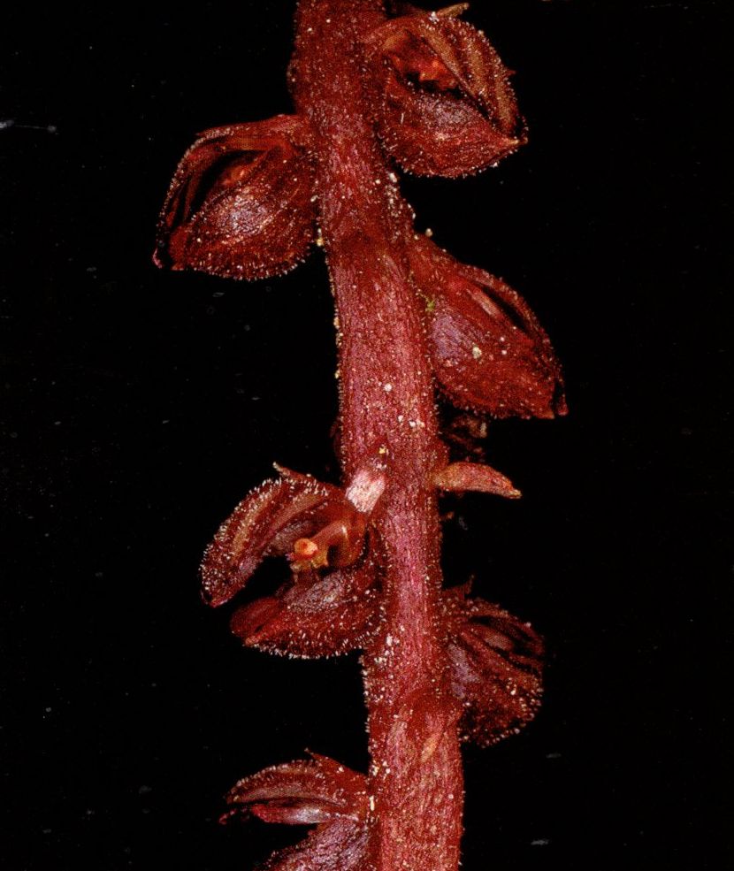 Found in Sulawesi in montane forest at elevations of 1300 to 1400 meters as a miniature sized, cool growing epiphyte with a creeping to shortly straggling rhizome enveloped by not persistent rhizome scales with .32 to .6" [.8 to 1.5 cm] between each conspicuous, ovoid-cylindrical, hardly angular pseudobulbs carrying a single, apical, erect, elliptic, acute, petiolate base leaf that blooms on a patent peduncle .6 to .8" [1.5 to 2 cm], provided with 4? bracts, rachis nodding, somewhat thickened, spindle-shaped, 1.2 to 2" [3 to 5 cm] long, ca .16" [4 mm] across, lax raceme, 1.6 to 2.8" [4 to 7 cm] long overall, 10 to 12 flowered inflorescence with acute, shorter than the ovary floral bracts.