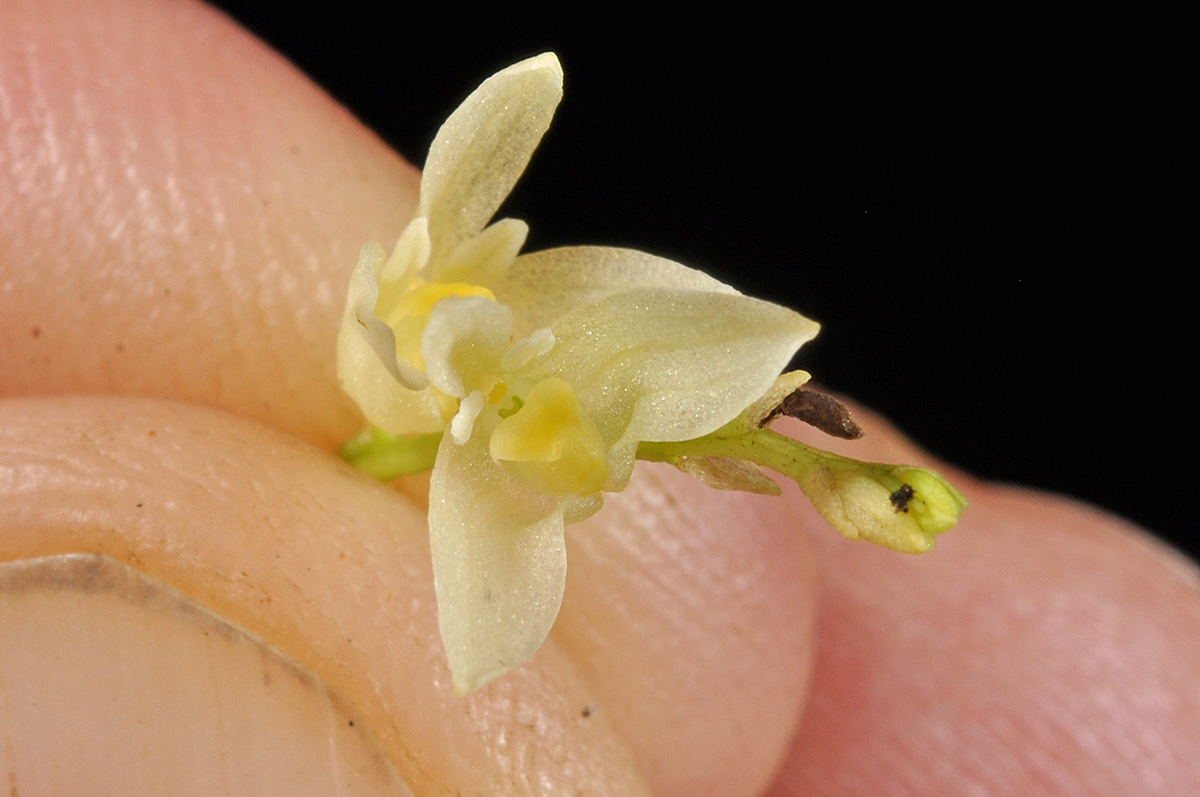 Found in the Philippines along montane ridges on mossy tree trunks at elevations of 800 to 1400 meters as a mini-miniature sized, warm to cool growing epiphyte with 4" [10 cm] between each non-existent pseudobulb carrying a single, apical, leathery, lanceolate mleaf that blooms on an erect, from the rhizome, to 3.2" [8 cm] long, to 8 flowered inflorescence carrying very fragrant flowers.