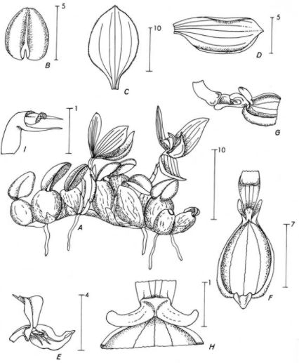 Found in western New Guinea in tree fern groves on Cyathea sp on tree trunks at elevations around 3420 meters as a mini-miniature sized, cold growing, mat forming epiphyte with a creeping, branched, glabrous rhizome giving rise to close set, erect, globose or obovoid-globose pseudobulbs at the base with 1 or 2 ovate, acute bracts and carrying a single, apical, spreading, coriaceous, glabrous, broadly ovate, elliptic, or obovate-orbicular, obtuse or retuse, part, V-shaped in cross-section, midrib grooved above, prominent below, margins slightly revolute, base cordate and plicate, narrowing below into a petiolate-like base leaf that blooms in the late summer and early fall on a solitary or rarely in bundles of 2, peduncle glabrous, .24 to .4" [6 to 10 mm] long,provided basally with 2 tubular, obliquely truncate, acute, 1-nerved bracts, single flowered inflorescence with a floral bract similar to the lower bracts.