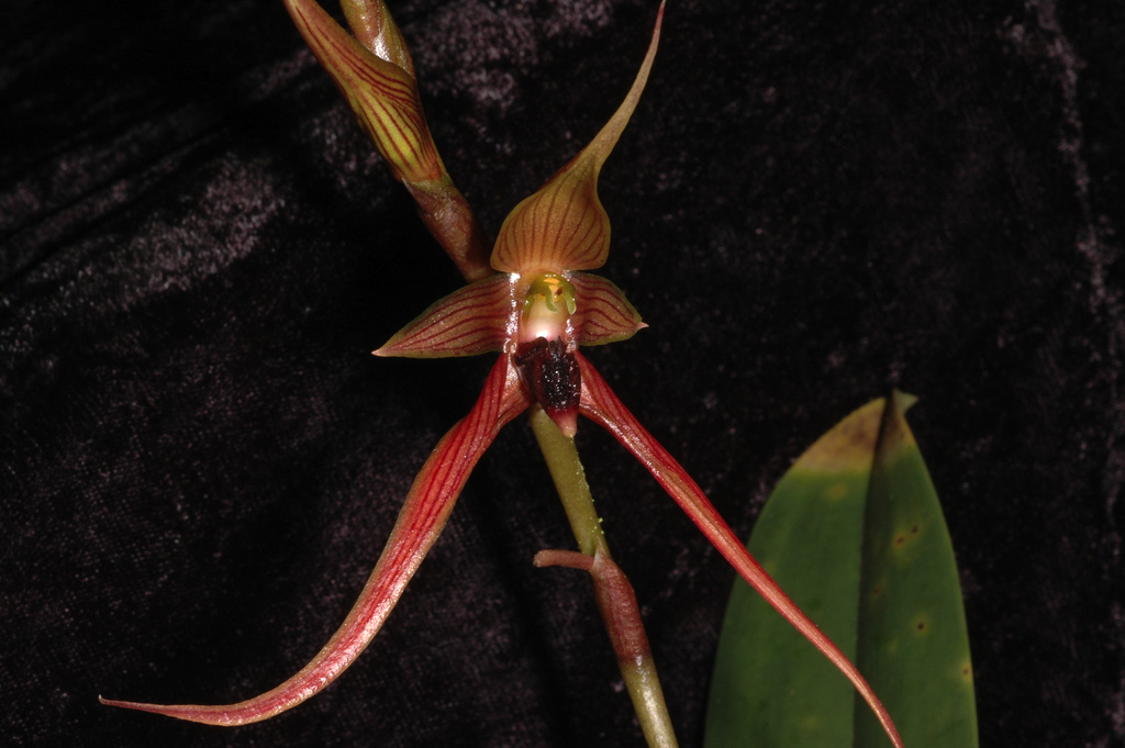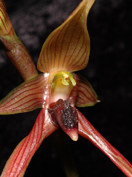 Found in the New Guinea and Sulawesi in forests close to lake shores at elevations of 300 to 500 meters as a small sized, hot to warm growing epiphyte with 1/2 to .68" between each ovoid, non angular pseudobulb carrying a single, apical, elliptic to obovate, acute, gradually narrowing below into the .75 to 3.2" [1.8 to 8 cm] long, petiolate base leaf that blooms in the spring on a erect to patent becoming porrect, lax, racemose, to 20" [to 50 cm] long, slightly fractiflex to not, successively single to 8 flowered inflorescence.