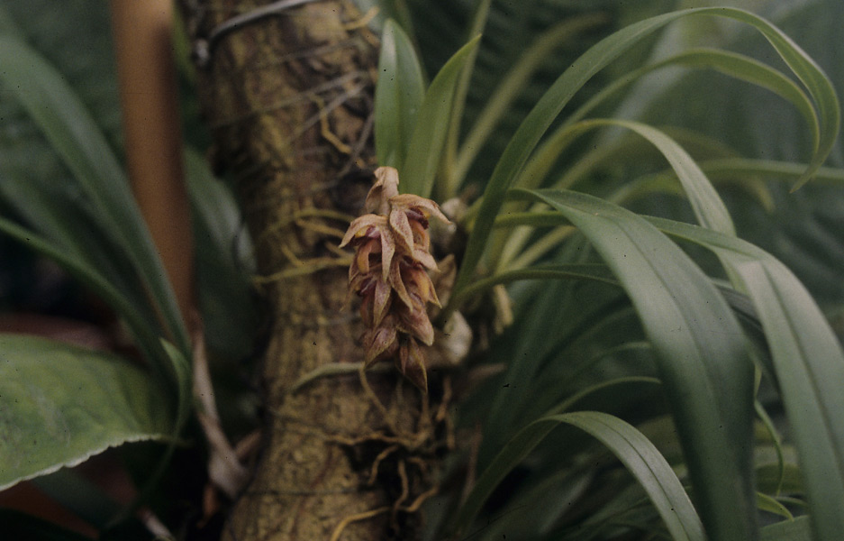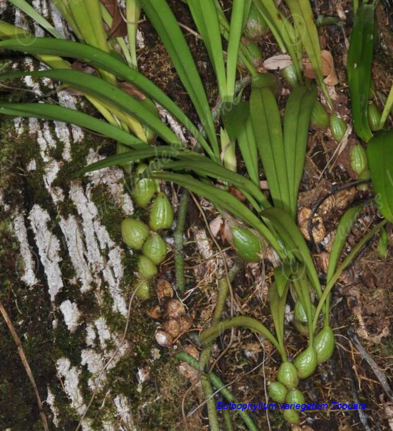Found in Madagascar, Mauritius and Reunion at elevations of sea level to 1200 meters as a mini-miniature to small sized, warm to cool growing epiphyte with an orbicular pseudobulb carrying two, apical, linear, acute, conduplicate below into the basally clasping leaf that blooms in the later spring through summer on a basal, erect, successively few to several flowered inflorescence
