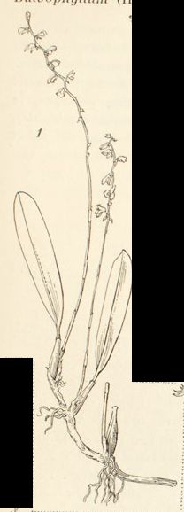 Found in northern and central Madagascar in lichen rich evergreen forests at elevations around 2000 meters as a miniature sized, cool to cold growing epiphyte with .8 to 1.2" [2 to 3 cm] between each slender, yellow, unangled pseudobulbs carrying a single, apical, oblong to oblanceolate, shortly contracted, petiolate base leaf that blooms in the fall, winter and spring on a basal, erect, peduncle 3.6 to 6" [9 to 15 cm] long, to 10.4" [to 26 cm] long overall, 10 to 22 flowered inflorescence with subacute, less than half the length of the flowers floral bracts and carrying non-resupinate flowers.