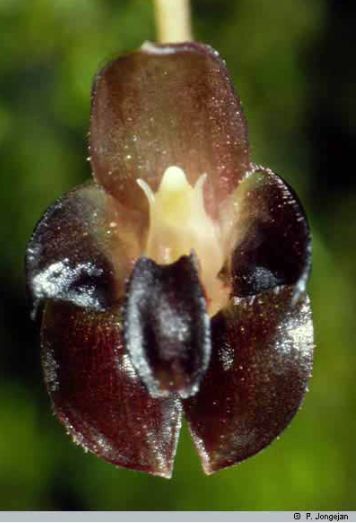 Found in New Guinea on trees in range forests at elevations around 1200 meters as a mini-miniature sized, cool growing epiphyte with a very short, filirom, flexuous rhizome giving rise to minute, cylindrical pseudobulbs carrying a single, apical, erect, oblanceolate-elliptic, minutely apiculate, narrowing below into the base leaf that blooms in the late fall and early winter on an erect, filiform, .4 to .68" [1 t o1.7 cm] long, single flowered inflorescence carrying non-resupinate flowers