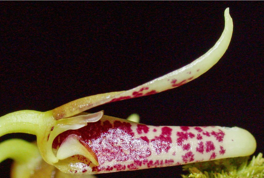 Schlechter states that the flowers are white, dotted with red inside, the apices of the sepals are yellowish and the lip is yellow. Similar to B rhomboglossum but this one has a much longer inflorescence and the flowers are differently colored.