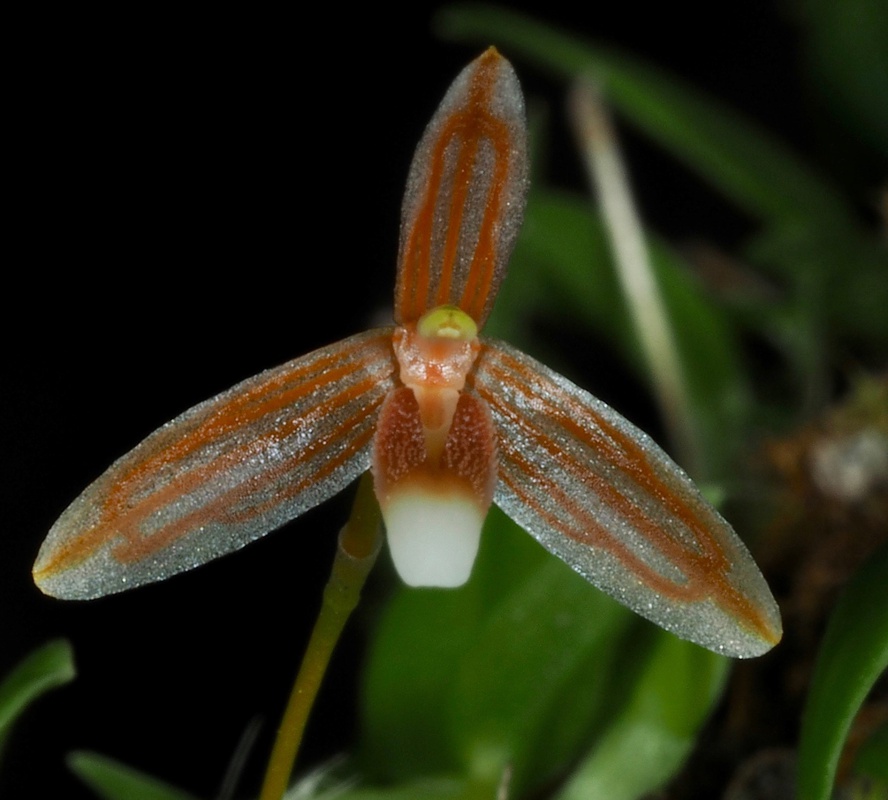 Found in Kalimantan Borneo and Aceh Sumatra in slightly disturbed, rather tall riverine forests at elevations of 500 to 600 meters as a mini-miniature sized, warm growng epiphyte with a creeping rhizome giving rise to ovoid to cylindrical, somewhat flattened or not psaeudobulbs carrying a single apical, erect, elliptic, rounded, petiolaet base leaf that blooms on an erect, peduncle to .56" [1.6 cm] provided with scales, to 1" [2.5 cm] long overall, single flowered inflorescence with shorter than the ovary floral bracts.
