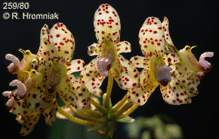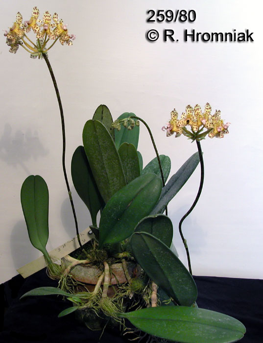 Found in Yunnan province of China and Laos in sparse woods on limestone slopes at elevations around 700 to 800 meters as a small sized, hot growing epiphyte or lithophyte on rocks with a creeping rhizome and 1.6 to 3.6" [4 to 9 cm] between each ovoid pseudobulb and carrying a single, apical, erect, somewhat fleshy, oblong to obovate-oblong, gradually narrowing below into the petiolate base leaf that blooms in the spring on a basal, [19 to 26 cm] long, suberect, subumbellate, 3 to 6 flowered inflorescence