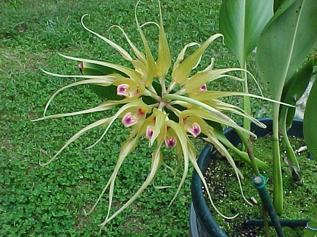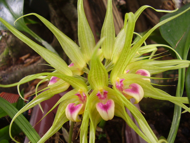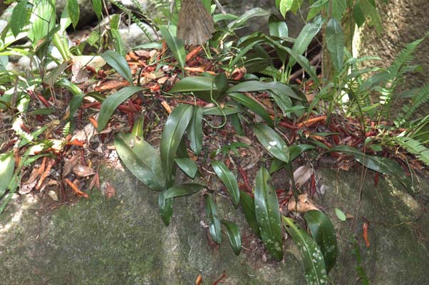Found in the Malaysian pennisula, Java, Sumatra, Borneo, Moluccas, Sulawesi and New Guinea at elevations around 760 meters as a medium sized, hot growing epiphyte with 8" [20 cm] between each prominently furrowed, terete pseudobulb enveloped basally by 2 sheaths and carrying a single, apical, tough, leathery, narrowed equally to the apex and the base, acute, narrowing below into the elongate petiolate base leaf that blooms in the summer on a 12" [30 cm] long, many flowered inflorescence enveloped by 6 imbricating sheaths and carrying 6 to 8, foul smelling, not wide opening flowers held in a circle.