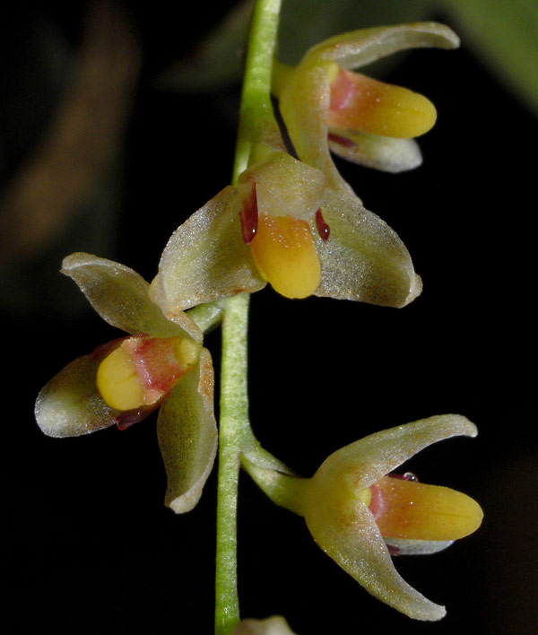 Found in penninsular Malaysia and Sabah Borneo at elevations around 1100 to 2000 meters as a miniature sized, warm to cold growing epiphyte with up to 5" [12.5 cm] between each pseudobulb and carrying a single, apical, erect, coriaceous, fleshy, rounded, slightly cleft leaf that blooms in the summer on a basal, either from the base of the leaf or along the rhizome, to 2.6" [6.5 cm] long, to 8 flowered inflorescence