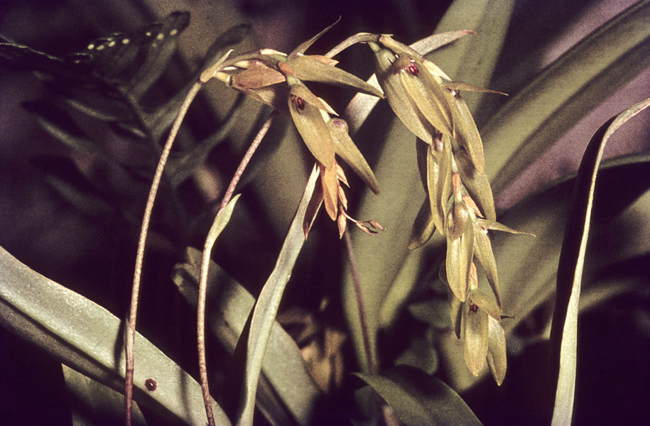 Found in the western Himalayas, Assam, Nepal, Bhutan and the eastern Himalayas at elevations of 2000 to 2300 meters as a small sized, cool growing epiphyte with caespitose, ovoid pseudobulbs carrying 2, apical, oblong-lanceolate, acute, thin, narrowing into the subsessile base leaves that blooms in the fall on a basal, erect, racemose, to 7.2" [18 cm] long, densely many flowered, strongly decurved rachis inflorescence with 3 distant, lanceolate, acute bracts and ovate-lanceolate, acute to acuminate floral bracts.