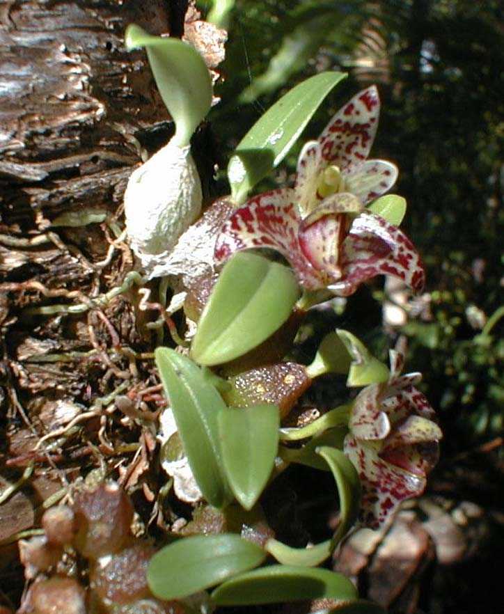 Found in Queensland and New South Wales Australia in rainforests on pine trees at elevations of 650 to 1200 meters as a mat forming, mini-miniature sized, warm to cool growing, unifoliate epiphyte with a creeping, branching rhizome giving rise to close set, conical to ovoid, irregularily furrowed pseudobulbs carrying a single, apical, erect to spreading, leathery, rigid, narrowly oblong to elliptic, acute to obtuse, shortly petiolate base leaf that blooms in the fall on an erect to suberect, 1 to 1 1/2" [2.5 to 3 cm] long, lateral from the base inflorescence with wide open flowers