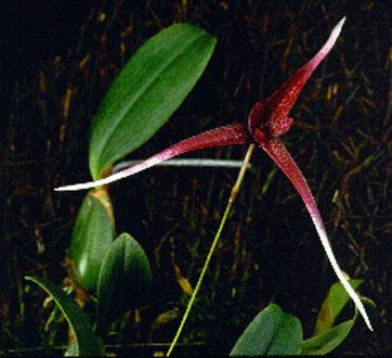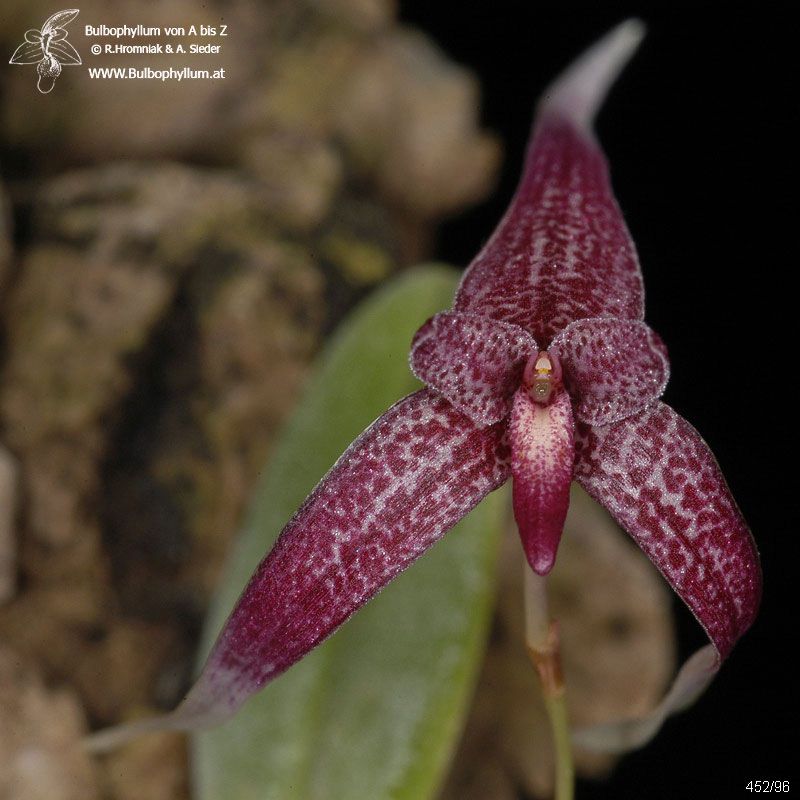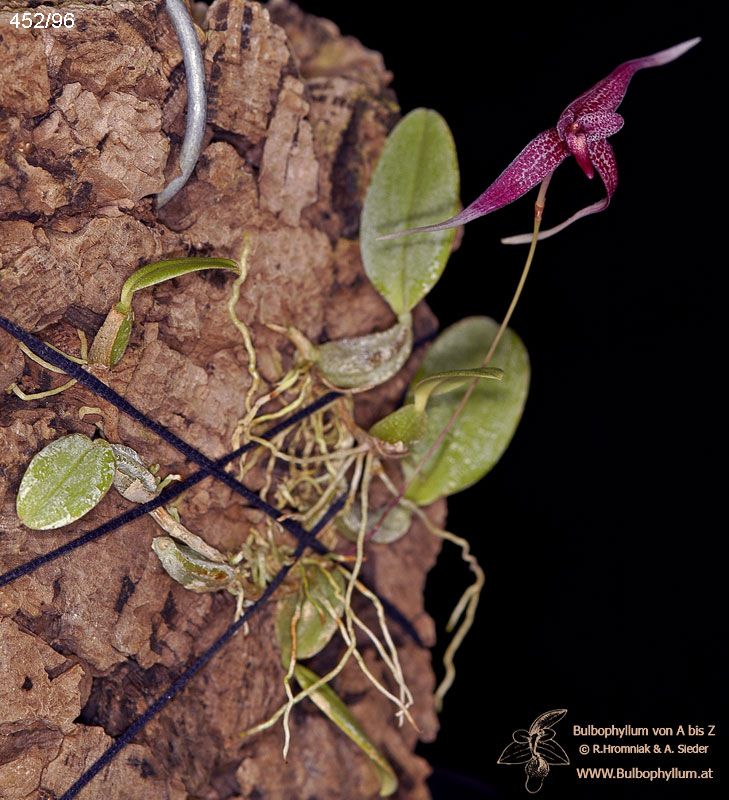 Found in the Philippines at elevations around 1400 to 2000 meters as a miniature sized, warm to cool growing epiphyte with .4 t o1.2" [1 to 3 cm] between each ovoid, curved pseudobulb carrying a single, apical, ovate to elliptic, obtuse leaf and blooms in the fall on a basal or from the rhizome, 3" [7.5 cm] long, single flowered inflorescence.