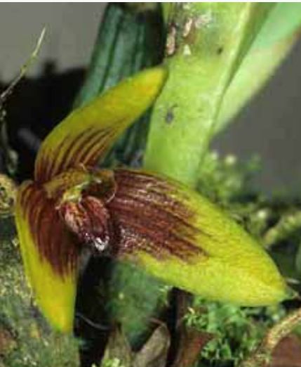 Found in Papua New Guinea in lower motane forests at elevations around 750 meters as a miniature to small sized, warm growing epiphyte with a rhizome giving rise to close together, conical pseudobulbs enveloped by large, ovate, papery, keeled mucronate sheaths and carrying a single, apical, lanceolate, acute, acuminate, subcoriaceous, pale green when dried, keeled, narrowing into the base leaf that blooms on a short, .4" [1 cm] long, single flowered inflorescence.