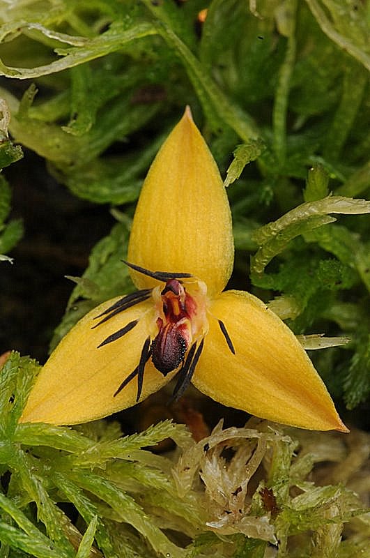 Found in Sulawesi in montane forests at elevations around 1200 meters as a small sized, warm growing epiphyte with a hanging rhizome with .4 to 3/4" [1 to 2.2 cm] between each ellipsoid to obovoid pseudobulb carrying a single, apical, erect, elliptic to ovate, acute, gradually narrowing below into the shortly petiolate base leaf that blooms in the fall through spring on a basal, porrect, .8" [2 cm] long, single flowered inflorescence