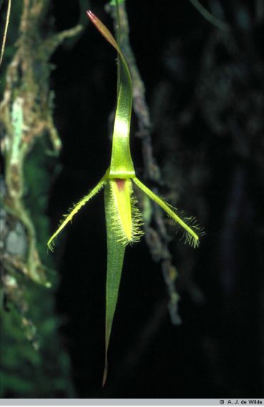 Found in Papua New Guinea on moss-covered Rhododendron bushes and small tree at elevations of 2600 to 2900 meters as a mini-miniature sized, cold growing epiphyte with a rather short, creeping, sparsely branching rhizome giving rise to close together, oblongoid-cylindrical, obliquely erect, longitudinally grooved with age pseudobulbs carrying a single, apical, erect, narrowly lanceolate, sometimes slightly oblique, 1.4-2.2 cm by 4-5 mm, thin-coriaceous, margins near apex minutely papillose, apex subacute, channelled, very shortly petiolate base leaf that blooms in the winter on a arising from the base of the pseudobulb, arching to pendulous, peduncle very thin, 2.8 to 5.2" [7 to 13 cm] long, glabrous, consisting of one internode, provided at the base with a tubular scale, single-flowered inflorescence with bell-shaped, oblique, shorter than the ovary floral bract.