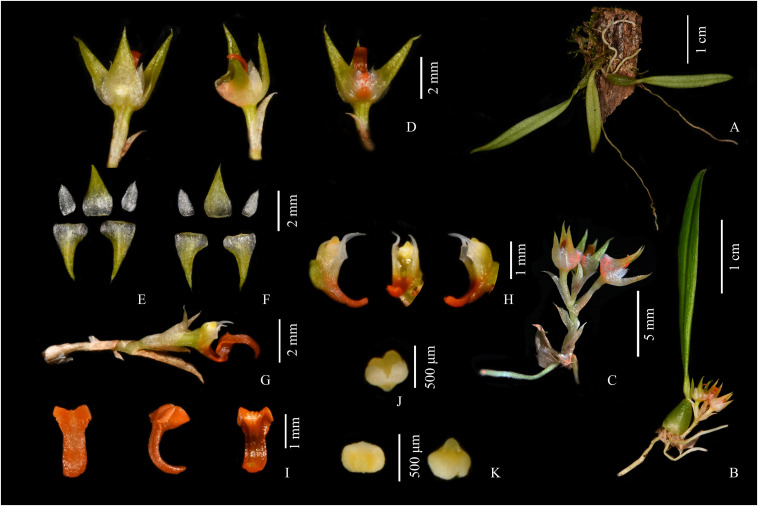 Bulbophyllum xizangense J.D. Ya & C. Liu 2021 -A & B. Plant C. Inflorescence; D. Flower (polar view, lateral view, dorsal view); E. Abaxial sepals and petals; F. Adaxial sepals and petals; G. Column and lip; H. Column lateral view, front view); I. Lip (front view, lateral view, dorsal view); J. Anther cap; K. Pollinarium. SECTION Desmosanthes [Bl.] J.J. Sm. 1933