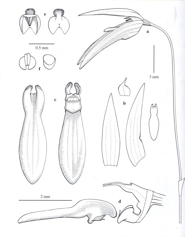 Found in Sarawak Borneo in lowlands as a hot growing epiphyte without vegitative parts that blooms on a basal?, peduncle .4 to .68" [1 to 1.7 cm] long, provided with 2 scales, 1.4 to 1.6" [3.5 to 4.5 cm] long ovarall, single flowered inflorescence with shorter than the ovary floral bracts.