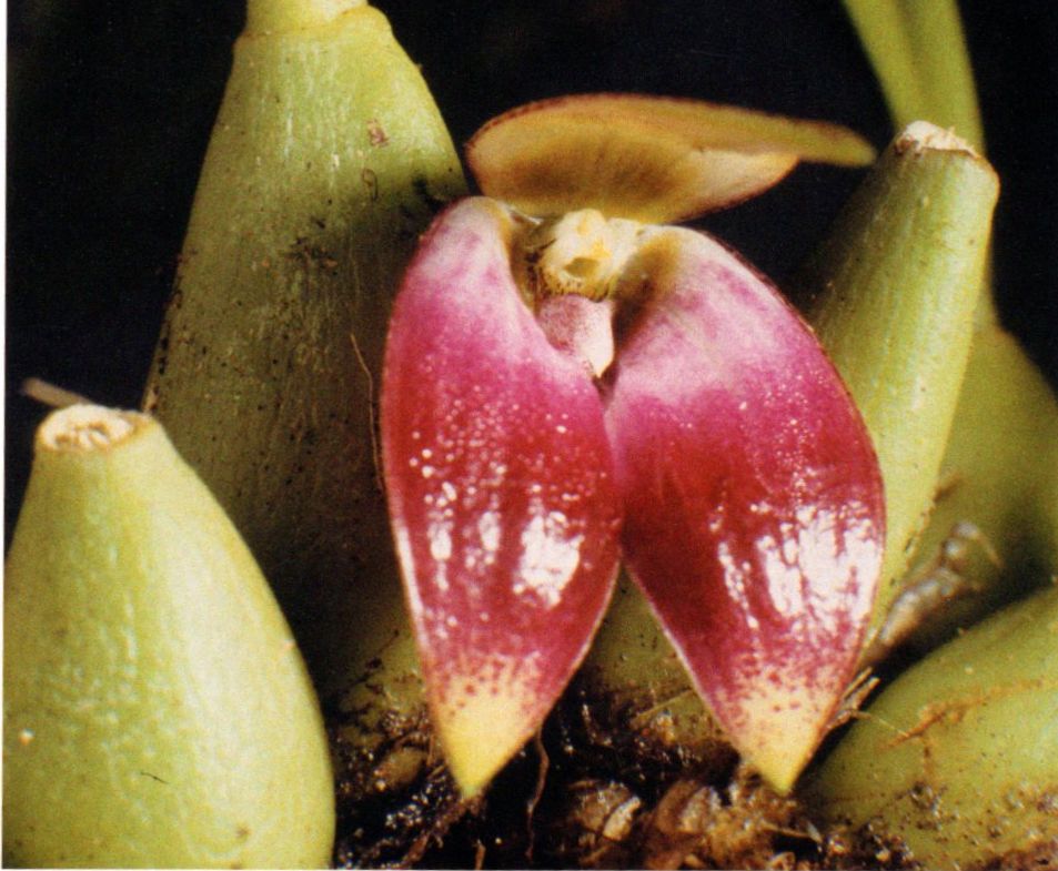 Found in western New Guinea in primary ridge forest at elevations around 600 meters as a small sized, warm growing epiphyte with .2" to .52 [.5 to 1.3 cm] between each distinct, loosely clustered, erect, ovoid pseudobulb with age wrinkling along numerous longitudinal lines and carrying a single, apical, erect, elliptic, acuminate, petiolate base leaf that blooms in the summer on 1 to a fascile of a few, basal, peduncle .44" [1.1 cm] long, provided with 2 scales, 2" [5 cm] long overall, single flowered inflorescence with much shorter to almost as long as the the ovary floral bracts.