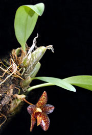 Found in Nepal, China and Vietnam at elevations around 1400 to 3200 meters as a mini-miniature sized, cool to cold growing epiphyte with a short, creeping rhizome with conical, curved pseudobulbs carrying a single apical, erect, spathulate to linear-spathulate, obtuse to minutely apiculate, gradually narrowing below into the petiolate base leaf that blooms in the spring on a basal, erect, 1.34 to 4.4" [3.6 to 11 cm] long, 1 to 2 flowered inflorescence with tubular, acute floral bracts.