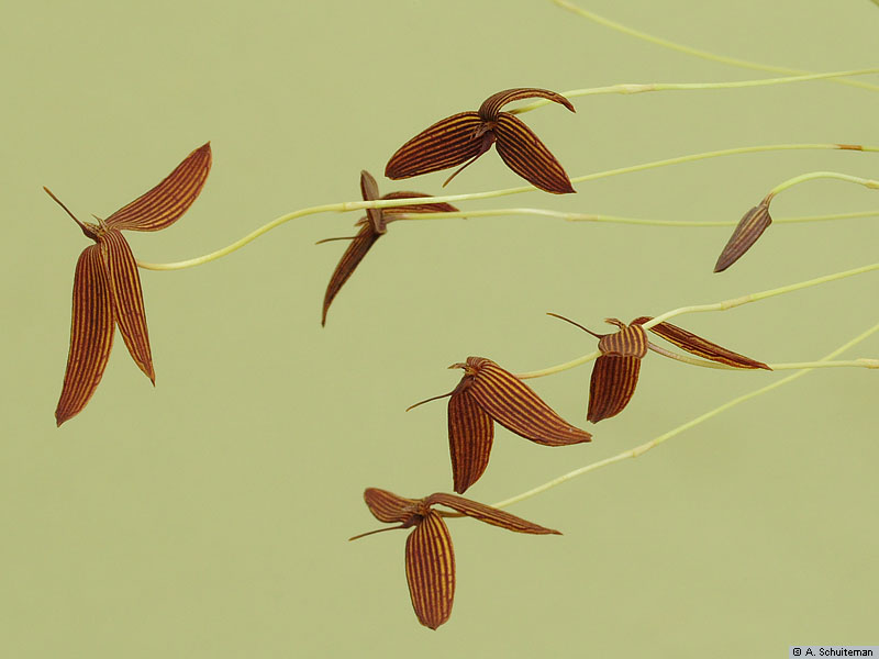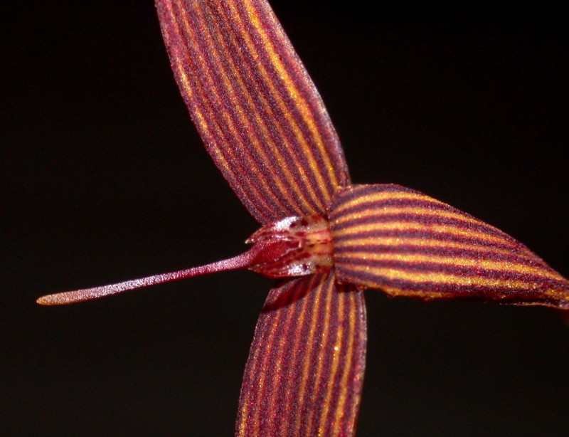 Found in Papua & New Guinea on trees in hill forests at elevations around 400 meters as a mini-miniature sized, hot growing epiphyte with .4 to .6" [1 to 1.5 cm] between each, oblong-cylindric, obtuse, 4 angled pseudobulbs carrying a single, apical, erect, ligulate, obtuse to minutely apiculate, glabrous, narrowing below into the base leaf that blooms in the late fall on a thin, filiform, 2" [5 cm] long, single flowered inflorescence.