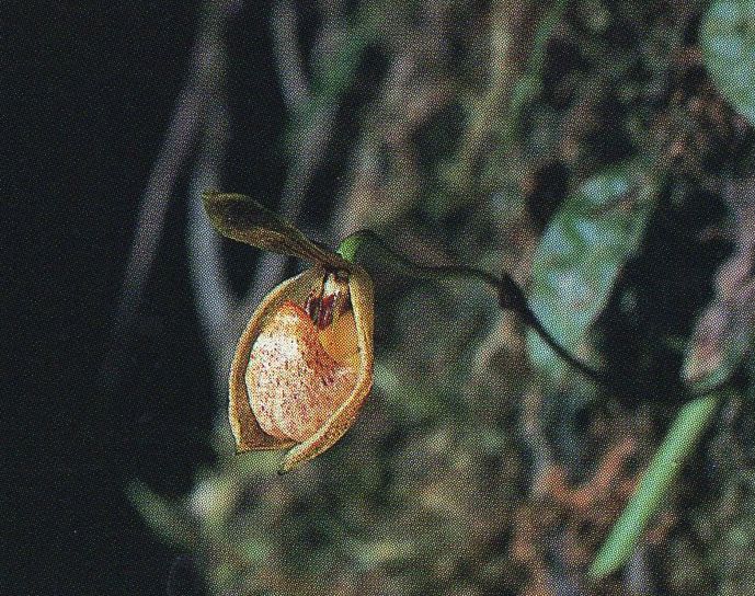 Found in New Guinea in forests at elevations around 2300 meters as a miniature sized, cold growing epiphyte with close set, conical-cylindrical pseudobulbs carrying a single, apical, erect, narrowly elliptic, acute, narrowly petiolate base leaf that blooms in the spring on a basal, setiform, 1.6 to 2" [4 to 5 cm] long, single flowered inflorescence