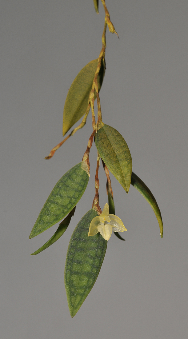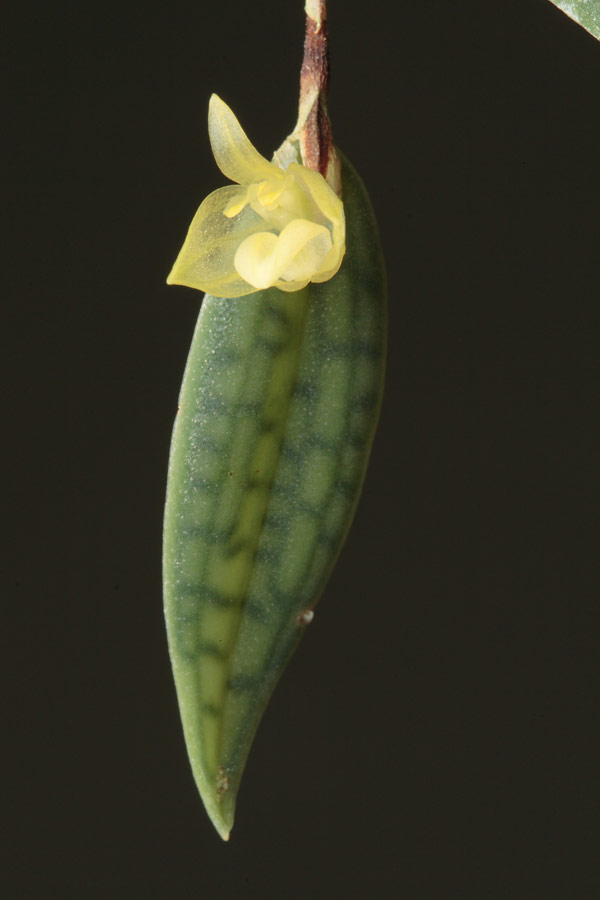 Found in Sabah Borneo in lower montane forests at elevations of 1100 to 2000 meters as a miniature to small sized, warm to cool growing, hanging epiphyte with a dark brown, wiry, hanging rhizome with .18 to .6" [.4 to 1.5 cm] between each cylindrical, not flattened pseudobulb and carrying a single, apical, thick, ovate to elliptic, medium to dark green, veins usually darker, narrowing into the petiolate base leaf that blooms in the summer on a very short, single flowered inflorescence carrying a scentless flower.