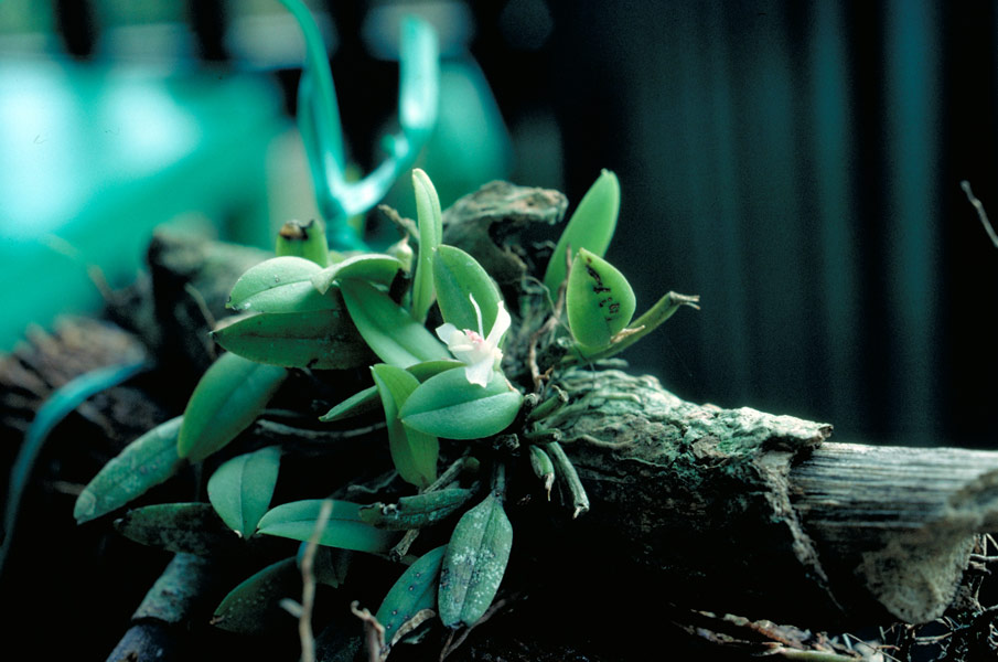 Found in western New Guinea at elevations around 120 meters as a mini-miniature sized, hot growing epiphyte with clustered, short, cylindrical, gradually widening towards the apex, 4 angled, sometimes witha black or brown apical ring stems carrying a single apical, elliptic, unequally bilobed apically leaf that blooms in the winter through summer on a short, successively single to 6 flowered inflorescence