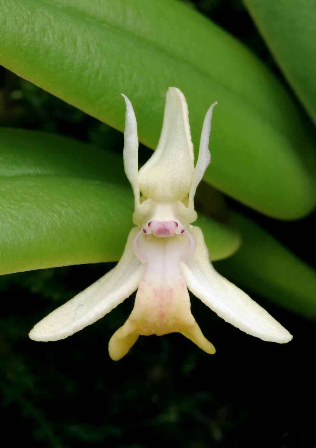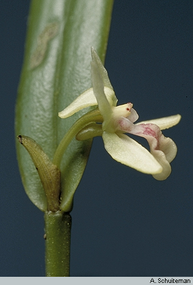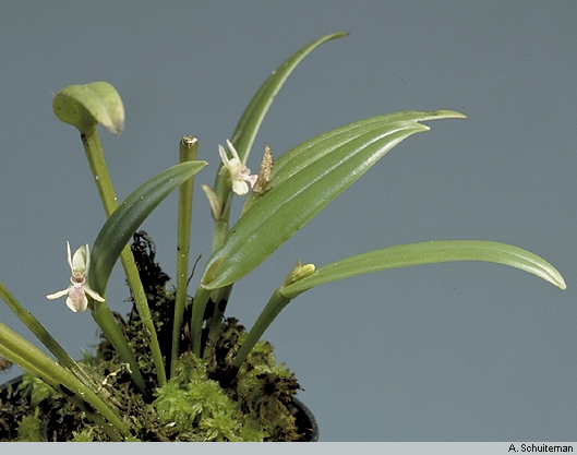 Found in New Guinea in montane and limestone hill forests at elevations of 600 to 1900 meters as a miniature sized, hot to cool growing epiphyte with close set, erect, slender, slightly thickeniong in the upper part stem carrying a single apical, erect, subfalcate, obliquely linear-lanceolate, fleshy-coriaceous, obtuse basally, unequally and acutely bidentate apically leaf that blooms in the winter and spring on a terminal, several succssively single flowered inflorescence arising through a linear-triangular spathe.