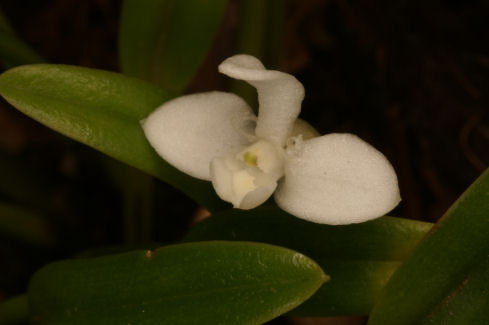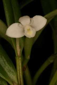 Found in New Guinea as a miniature sized, cool to warm growing epiphyte with elongate, thin, cylindrical pseudobulbs carrying a single apical, conduplicate, basally narrowing into a petiolate base leaf that blooms in the late spring and summer on a very short, single flowered inflorescence with the flower held at the leaf and pseudobulb junction.