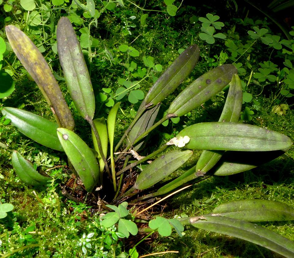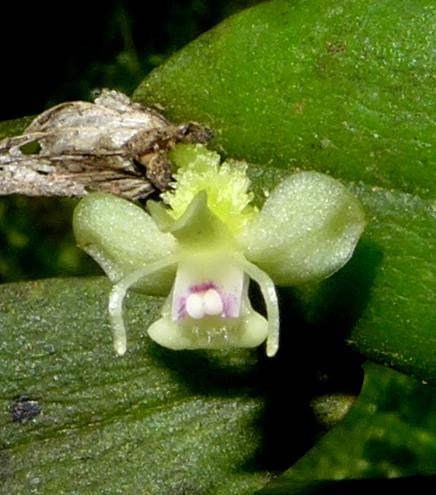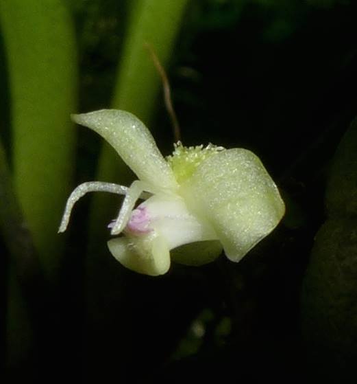Found in Papua New Guinea and the Bismark Archipelago in sea level rainforests as a miniature sized, hot growing epiphyte that blooms in the summer on a short, single flowered inflorescence holding the flower at the leaf base and arising through a dry spathe and has a pubescent pedicel and ovary.