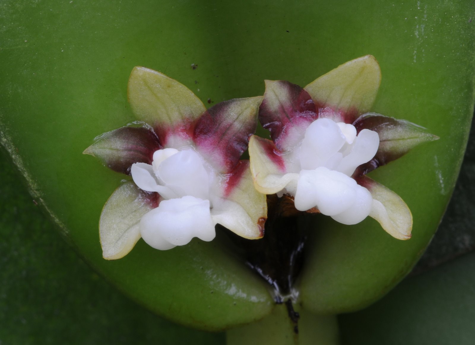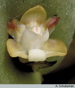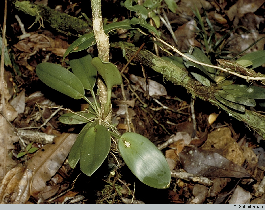 Found in Papua and New Guinea and Irian Jaya as a miniature sized, hot to warm growing epiphyte at elevations of 50 to 500 meters on mossy trunks of smaller trees in the understory of dense rainforests on ridges of hill-country that has an erect stem broadening gradually to the apex which has a single, apical, deeply conduplicate slightly decrved in the upper half, oblong leaf and blooms mostly in the fall, but can be any time on an apical, short inflorescence with a single flower held at the leaf base and the occasional flowers opening in succession one at a time.