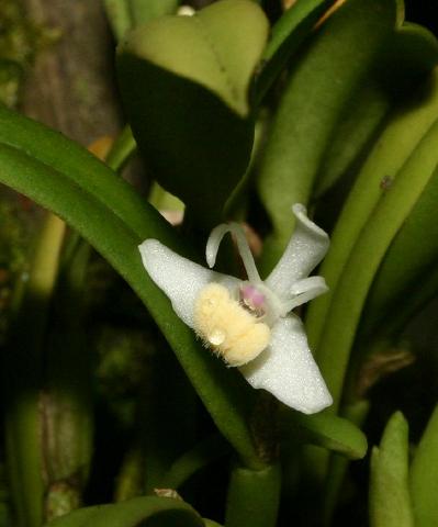 This species is from eastern Australia and New Guinea and found at sealevel up to 1400 meters on trees and rocks in tropical rainforest, open forest and in mangrove swamps and is a hot to cool growing, miniature sized, densly tufted, epiphytic plant, with small, pencil-like, shallowly sulcate pseudobulbs subtended by a close sheathing bract and carrying 2, apical, oblong, suberect, emarginate leaves that blooms repeatedly in the spring through fall at the base of the leaf and the top of the pseudobulb with a small, short-lived, solitary, vanilla scented flower, opening in succession over months