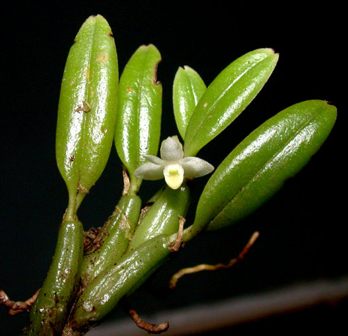 Found in New Guinea and Queensland Australia at elevations around 500 to 800 meters as a mini-miniature sized, warm growing creeping epiphyte with a creeping to hanging, frequently branching, cylindrical rhizome with close set, knocked over to one side, narrowly ovoid to subcylindric to fusiform, ventrally channeled, shiny, light green, smooth becoming wrinkled with age pseudobulbs carrying a single, terminal, erect to decurving, darker green, thick, stiff to leathery, elliptic to ovate to oblong, equally acutely bilobed apically leaf that blooms in the fall through spring on a terminal, short, single flowered inflorescence arising through a very small, deltoid, brown black bract.