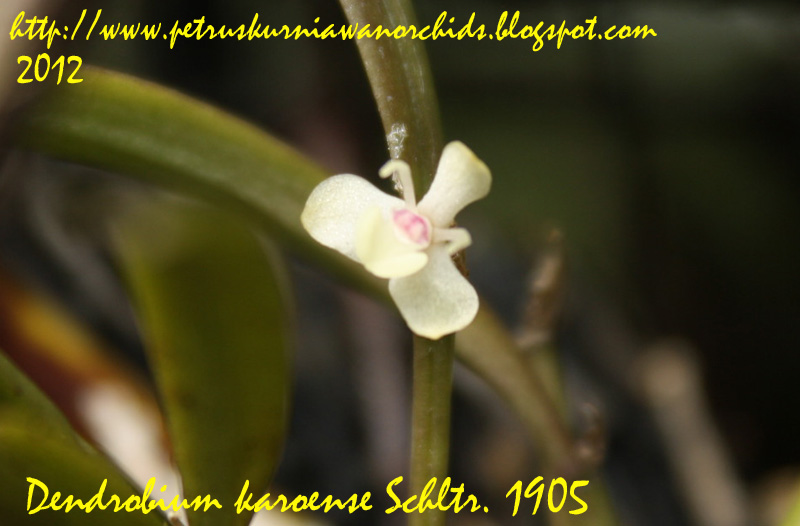 References W3 Tropicos, Kew Monocot list , IPNI ; Orchidaceae Monandre-Dendrobiinae Fr. Kraenzlin 1910 as Dendrobium karoense; *Orchidaceae of German New Guinea Schlechter 1912/85 drawing fide; Die Orchideen lieferung 11 Schlechter/Brieger 1981; Lowland Orchids of Papua New Guinea O'Byrne 1994 drawing good; Dendrobium and its relatives Lavarack, Stocker and Harris 2006 photo fide;