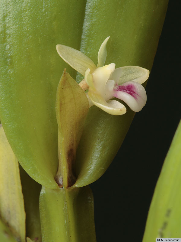 Found in New Guinea and Queensland Australia in lowland and lower montane forests at elevations of 100 to 900 meters as a miniature sized, hot to warm growing epiphyte with ovoid, shiny, light green pseudobulbs carrying a single, darker green, elliptic, equally acutely bilobed apically leaf that blooms in the winter, summer and fall on a terminal, short, single flowered inflorescence