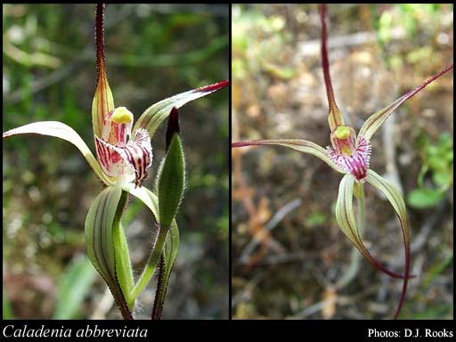Caladenia abbreviata Hopper & A.P.Br. 2001 SUBGENUS Jonesiopsis Photography by D J Rooks . Image used with the permission of the Western Australian Herbarium, Department of Environment and Conservation (http://florabase.dec.wa.gov.au/help/copyright). Accessed on Wednesday, 29 August 2012 © and The Flora Base Website