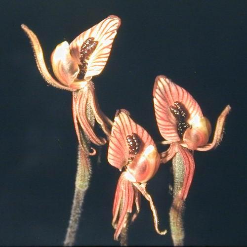 This small to medium sized, cold growing terrestrial species is found in south west Western Australia at elevations of 5 to 300 meters in forest and coastal heaths and has a single, pilose, linear leaf tinged in red and blooming in the late winter and spring on an erect, to 12" [30 cm] long, 1 to 2 flowered inflorescence.